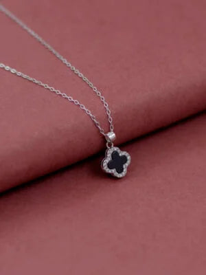 A sophisticated sterling silver chain featuring a sleek and mysterious onyx pendant. The smooth, black and white onyx stone adds a touch of drama and sophistication to this classic design.