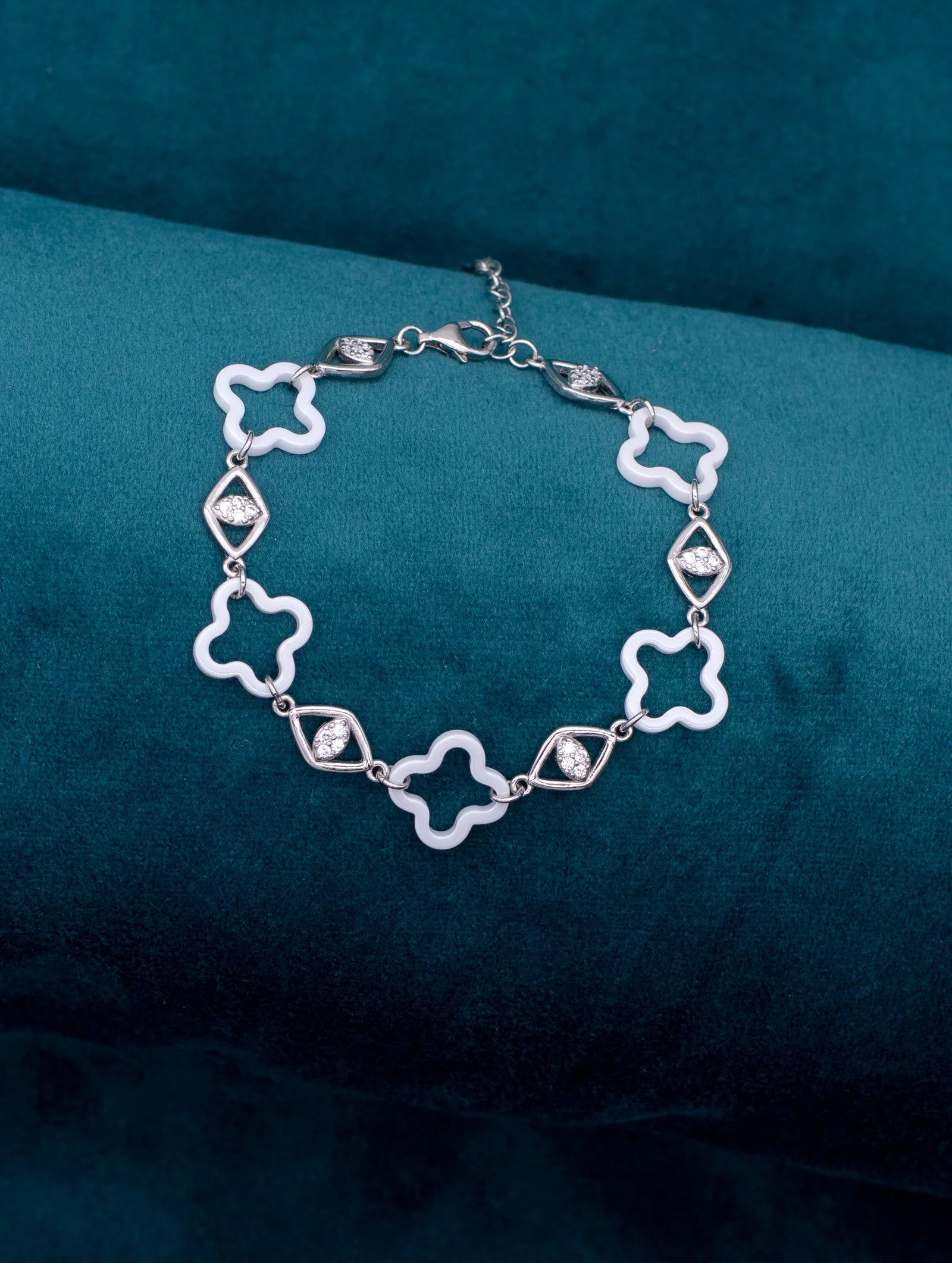A sterling silver adjustable bracelet featuring white Swarovski zircon and a very unique design. This bracelet combines elegance with individuality, offering a stylish accessory with a touch of sparkle and a distinctive flair. The adjustable feature adds versatility, making it suitable for various wrist sizes and occasions