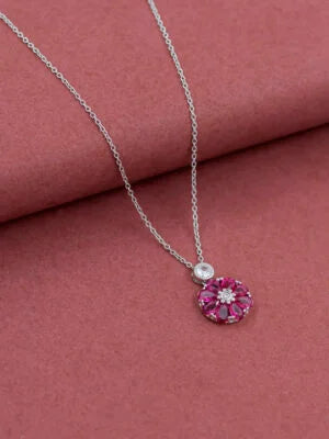 Enhance your elegance with our sterling silver chain, featuring a circular pendant adorned with pink stones arranged in a delicate flower shape. This charming piece adds a touch of floral beauty and sophistication to any outfit, making it perfect for both everyday wear and special occasions.
