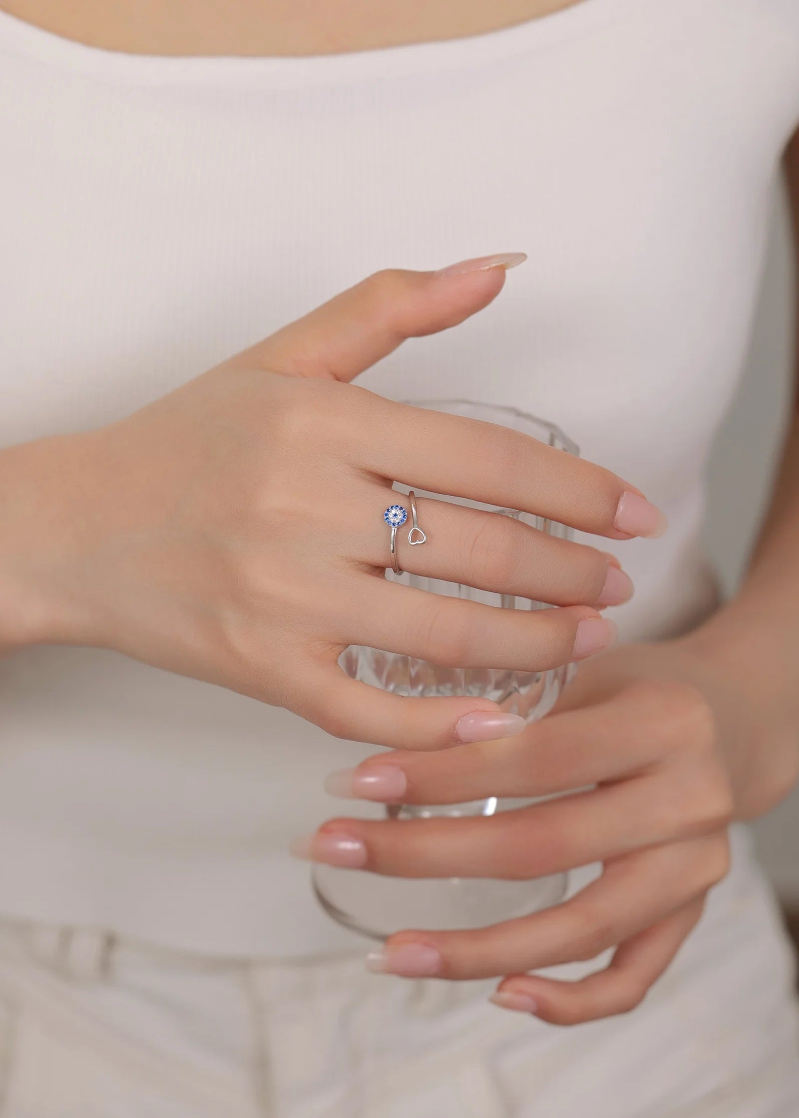Ward off negativity with our sterling silver adjustable ring featuring an evil eye design. This versatile piece combines protective symbolism with modern elegance, making it a perfect accessory for any occasion.