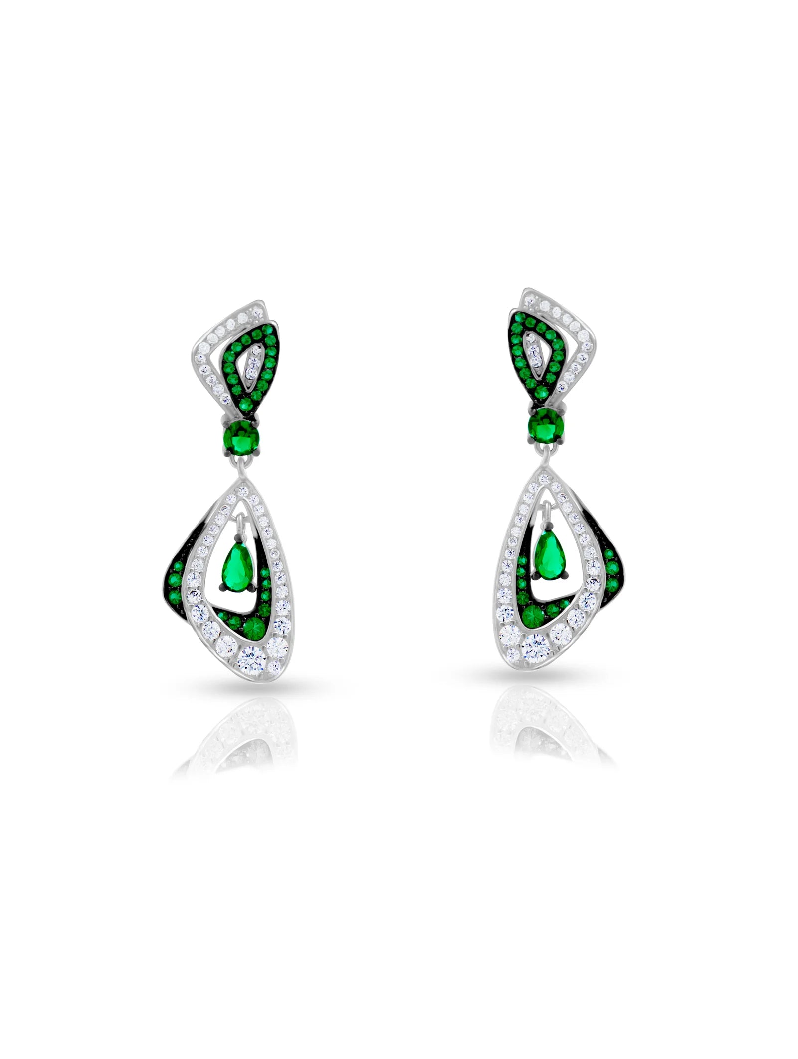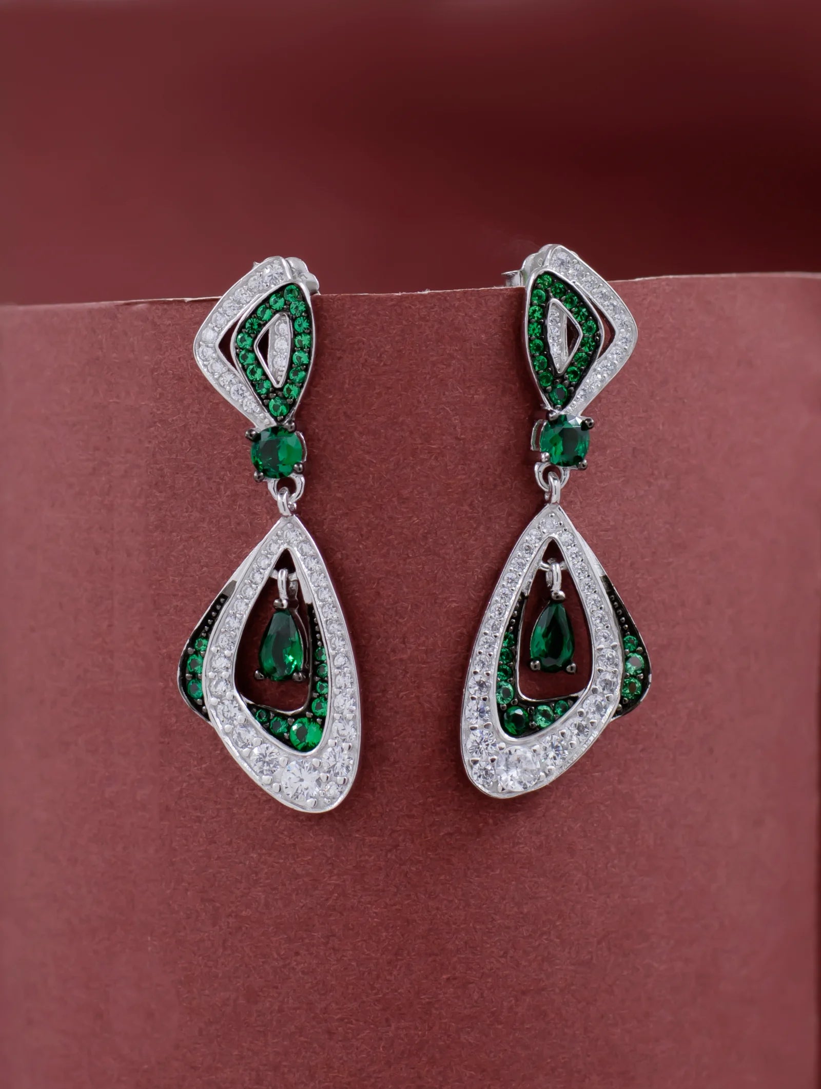 These sterling silver earrings, featuring vibrant green emerald stones surrounded by brilliant white zircons, epitomize the perfect fusion of timeless sophistication and modern allure.